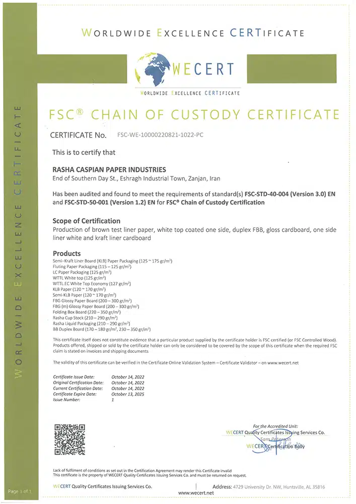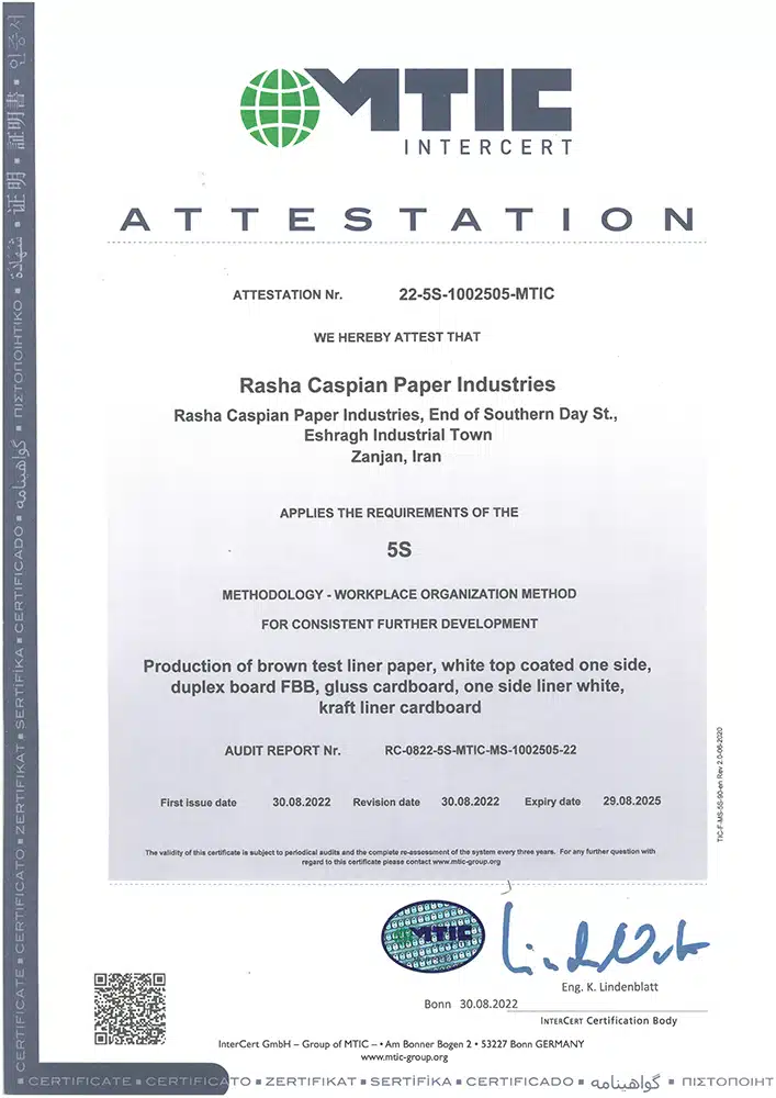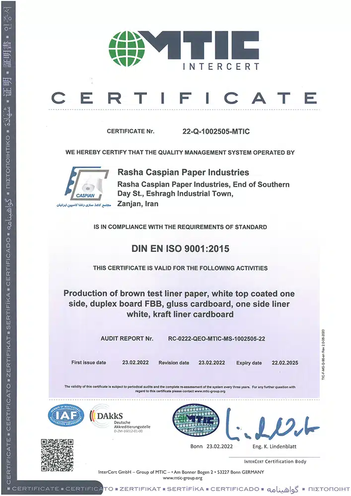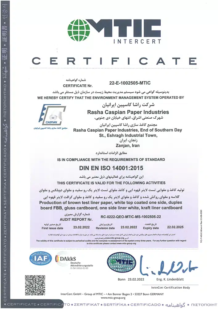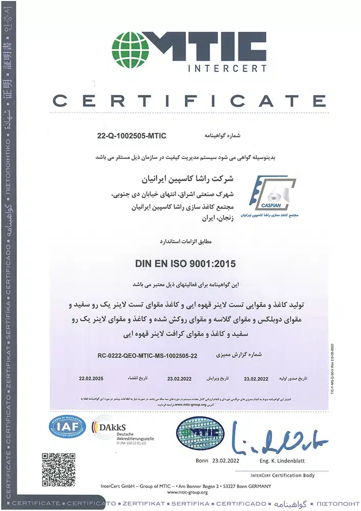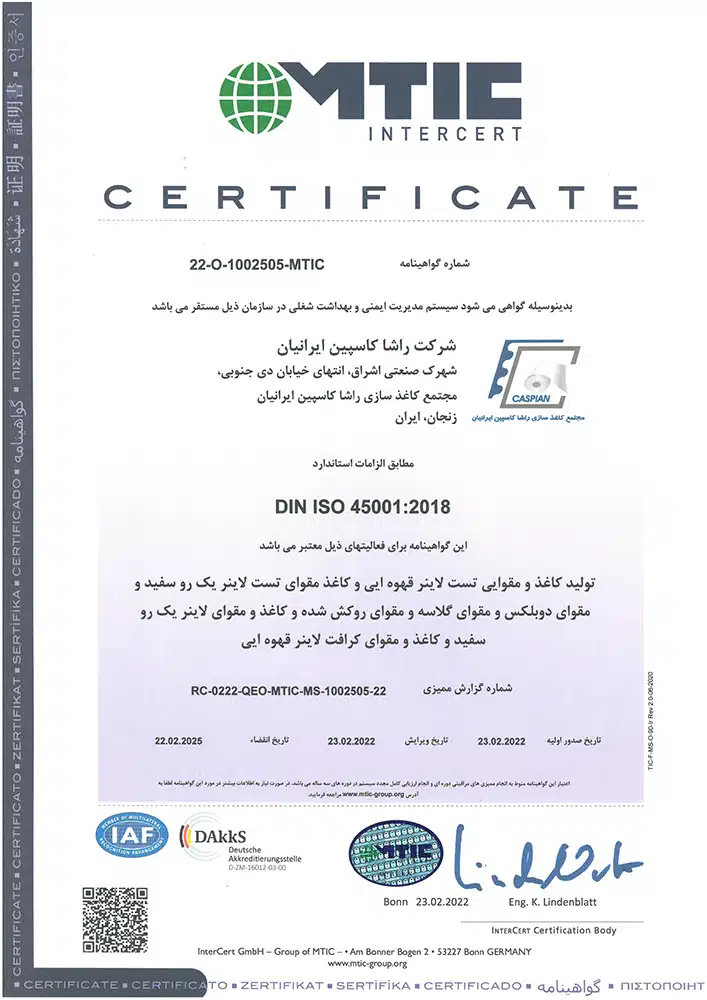 افتخارات و موفقیتها مجتمع کاغذسازی راشا کاسپین ایرانیان تندیس ها تندیس بیست وچهارمین جشنواره خیرین مدرسه ساز استان زنجان تندیس طرح صنعتی نمونه به مناسبت روز ملی صنعت و معدن تندیس اهدایی موسسه خیریه پرتو مهر یزدان تندیس اهدایی شرکت ملی گاز به مناسبت مدیریت استفاده بهینه از گاز طبیعی تقدیرنامه ها تقدیرنامه انجمن خیریه حمایت از بیماران مبتلا به سرطان استان زنجان لوح سپاس انجمن حمایت زندانیان زنجان از طرف دادستان عمومی و انقلاب استان زنجان و رئیس هیئت مدیره انجمن حمایت زندانیان زنجان تبریک نماینده مردم زنجان و طارم در مجلس شورای اسلامی به مناسبت نوروز 98 لوح سپاس مدیرکل تعاون؛کار و رفاه اجتماعی استان زنجان با عنوان مسائل حفاظت فنی و ایمنی لوح سپاس استاندار زنجان با عنوان طرح نمونه صنعتی لوح سپاس از حمایت کودکان بی سرپرست و بد سرپرست موسسه خیریه پرتو مهر یزدان از طرف رئیس هیئت مدیره موسسه پرتو مهر یزدان و مدیرکل اداره کل بهزیستی زنجان ISO WECERT (WORLDWIDE EXCELLENCE CERTIFICATE) ATTESTATION Nr. 22-5S-1002505-MTIC DIN EN ISO 9001: 2015 DIN EN ISO 9001: 2015 DIN EN ISO 9001: 2015 DIN EN ISO 14001: 2015 DIN EN ISO 14001: 2015 DIN ISO 45001:2018 DIN ISO 45001:2018