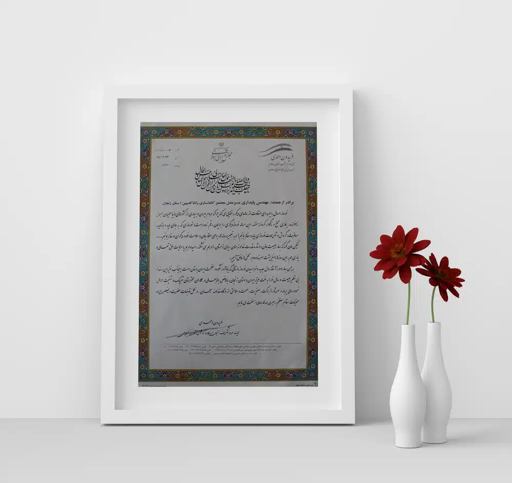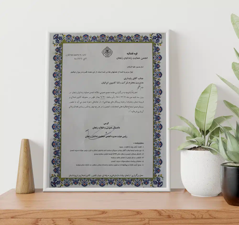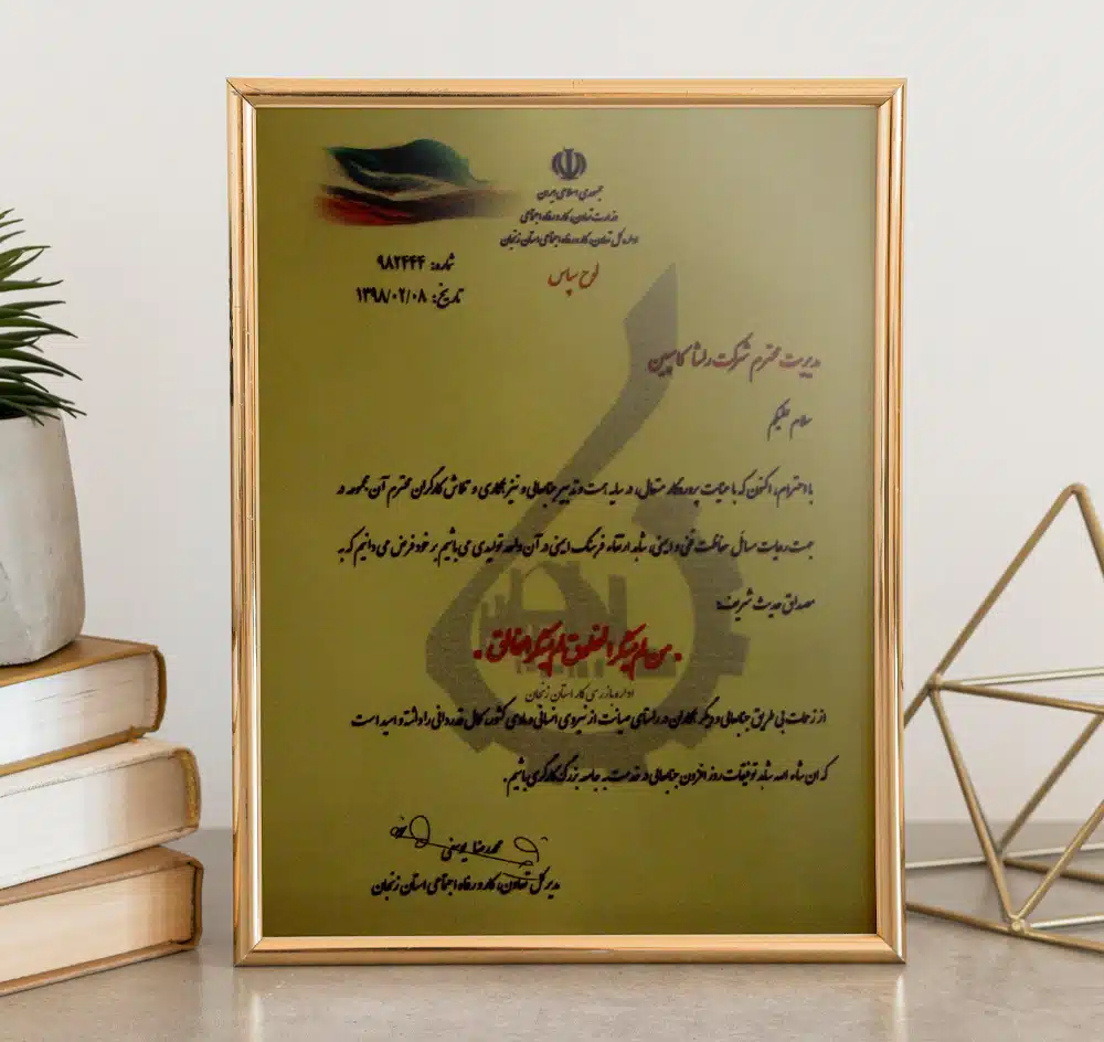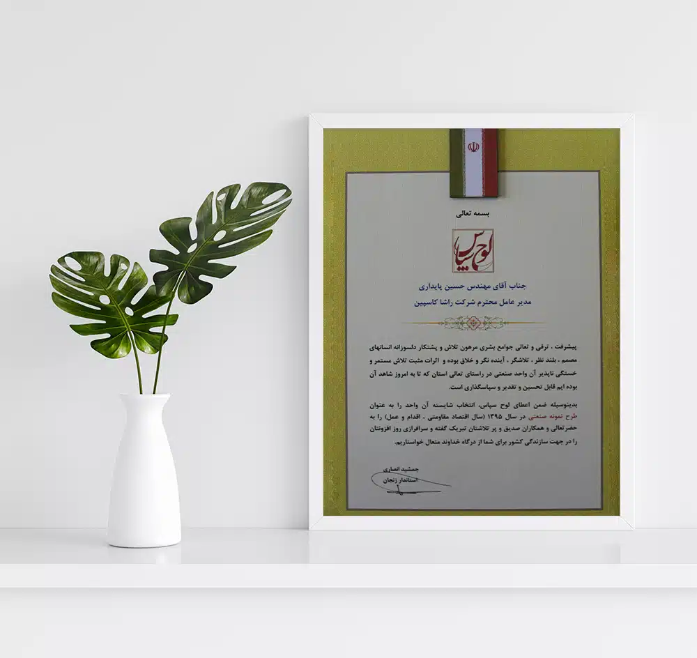 افتخارات و موفقیتها مجتمع کاغذسازی راشا کاسپین ایرانیان تندیس ها تندیس بیست وچهارمین جشنواره خیرین مدرسه ساز استان زنجان تندیس طرح صنعتی نمونه به مناسبت روز ملی صنعت و معدن تندیس اهدایی موسسه خیریه پرتو مهر یزدان تندیس اهدایی شرکت ملی گاز به مناسبت مدیریت استفاده بهینه از گاز طبیعی تقدیرنامه ها تقدیرنامه انجمن خیریه حمایت از بیماران مبتلا به سرطان استان زنجان لوح سپاس انجمن حمایت زندانیان زنجان از طرف دادستان عمومی و انقلاب استان زنجان و رئیس هیئت مدیره انجمن حمایت زندانیان زنجان تبریک نماینده مردم زنجان و طارم در مجلس شورای اسلامی به مناسبت نوروز 98 لوح سپاس مدیرکل تعاون؛کار و رفاه اجتماعی استان زنجان با عنوان مسائل حفاظت فنی و ایمنی لوح سپاس استاندار زنجان با عنوان طرح نمونه صنعتی لوح سپاس از حمایت کودکان بی سرپرست و بد سرپرست موسسه خیریه پرتو مهر یزدان از طرف رئیس هیئت مدیره موسسه پرتو مهر یزدان و مدیرکل اداره کل بهزیستی زنجان ISO WECERT (WORLDWIDE EXCELLENCE CERTIFICATE) ATTESTATION Nr. 22-5S-1002505-MTIC DIN EN ISO 9001: 2015 DIN EN ISO 9001: 2015 DIN EN ISO 9001: 2015 DIN EN ISO 14001: 2015 DIN EN ISO 14001: 2015 DIN ISO 45001:2018 DIN ISO 45001:2018
